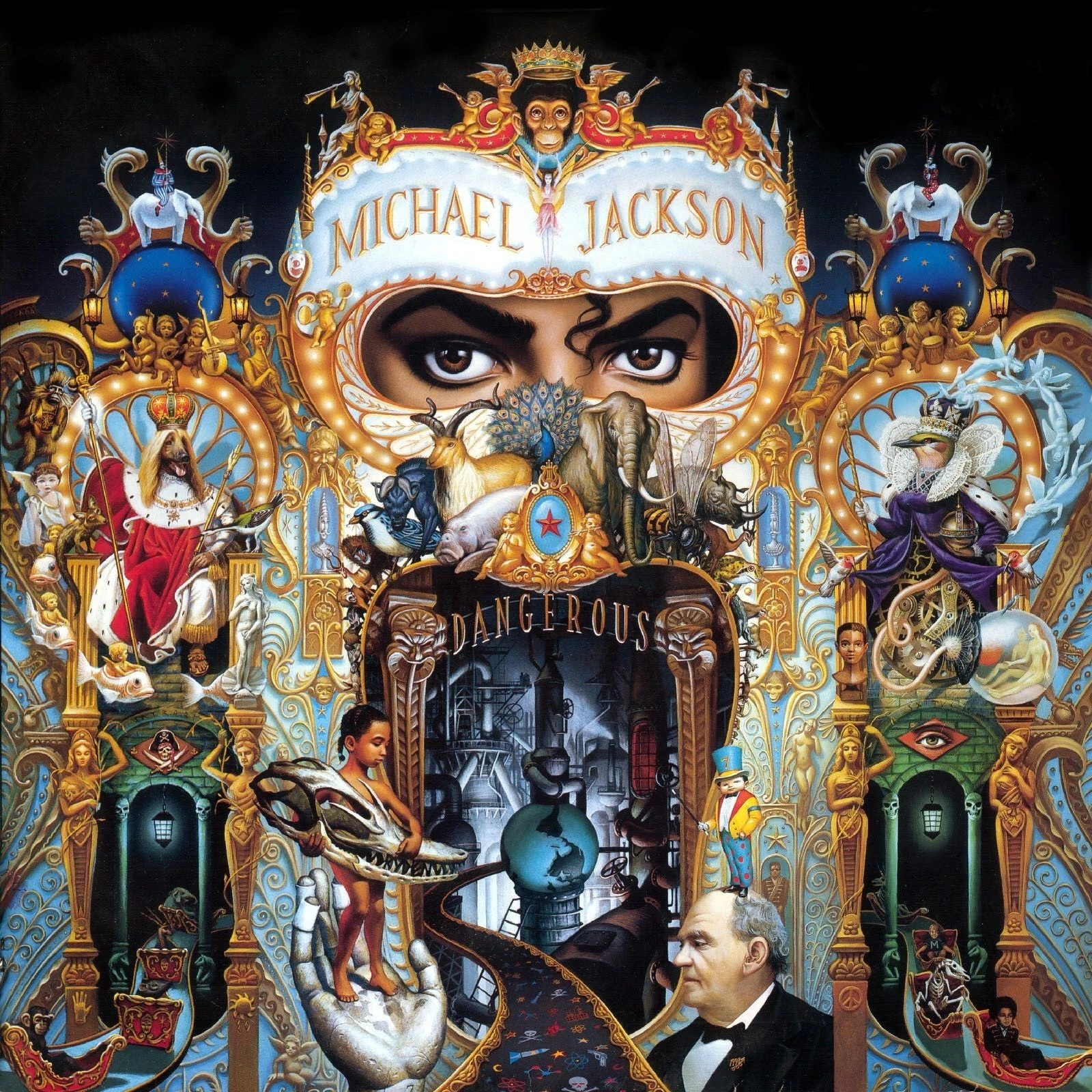 The Dangerous cover was painted by Mark Ryden and displays the singer's eyes and a single lock of his hair behind a gold masquerade mask, surrounded by various obscure animals and objects.