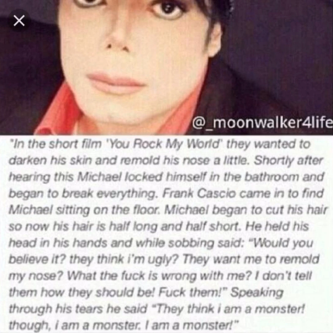 The production of the "You Rock My World" short film was mixed. Jackson described behind the scenes as lots of fun.[1] However, as it's currently known, while filming, Michael was suggested by the director to remold his nose using prosthetics and to use makeup to darken his skin. After hearing the proposition, he run off to the bathroom, locked himself in it and started to break everything out of anger. A friend of Michael's, Frank Cascio came in to the bathroom to check on him. However, he found him sitting on the floor and cutting his hair off, crying. He was then told by the artist: